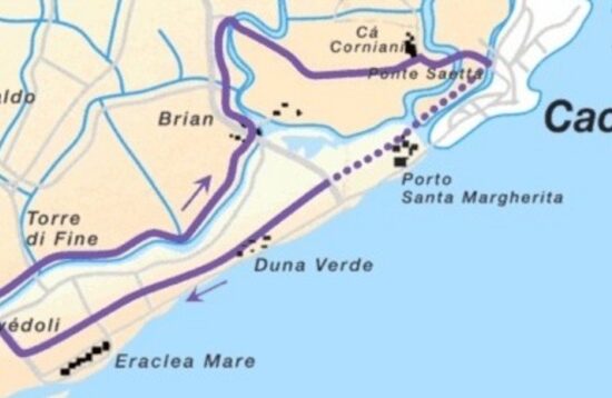 Caorle. Usciamo dalla città passando sotto il cavalcavia e attraversato il Ponte Saetta si gira subito a sinistra per Porto Santa Margherita e Duna Verde utilizzando la nuova pista ciclabile. Al Km 5,4 incrociamo la rotatoria che aggiriamo proseguendo dritti…