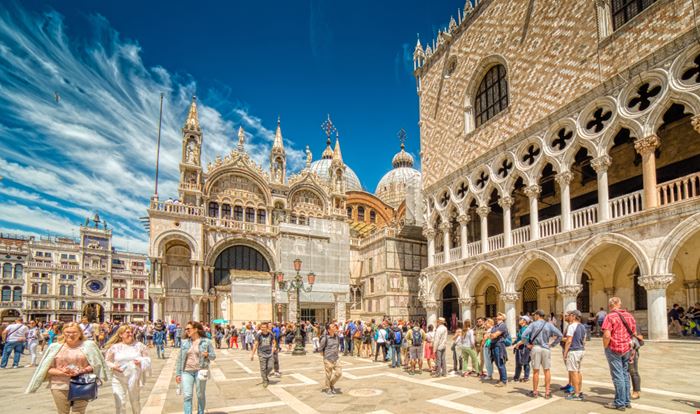 Centro della città è l’ampia piazza S. Marco che sembra un immenso salone marmoreo racchiuso tra la facciata della basilica, la torre dell’Orologio, le Procuratie Vecchie con un portico di 50 arcate e due sovrapposti ordini di finestre, già sede dei Procuratori di S. Marco, la Fabbrica Nuova eretta nel 1810 sviluppando lo schema costruttivo delle Procuratie Nuove.
